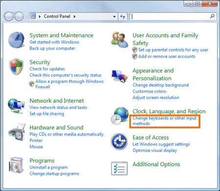The control panel window has many different appearances. If your window looks like this picture, click Change keyboard or other input methods. This will open another window.
