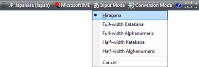 2. From the Language Bar, choose Japanese. Then, from the Input Mode menu on the language bar, choose Hiragana.